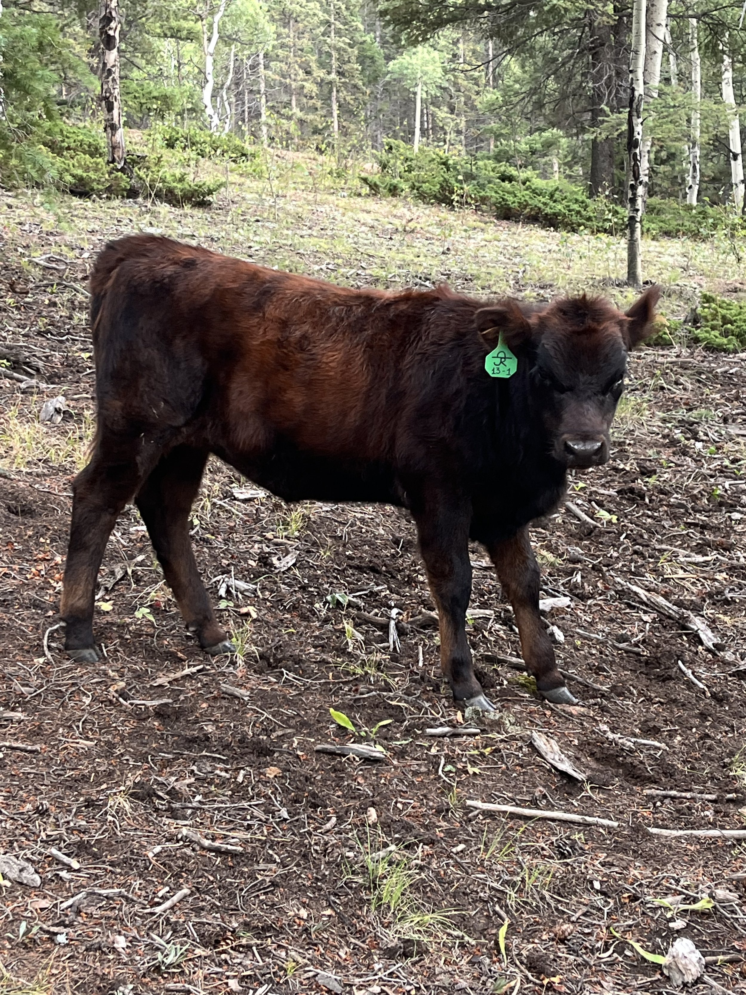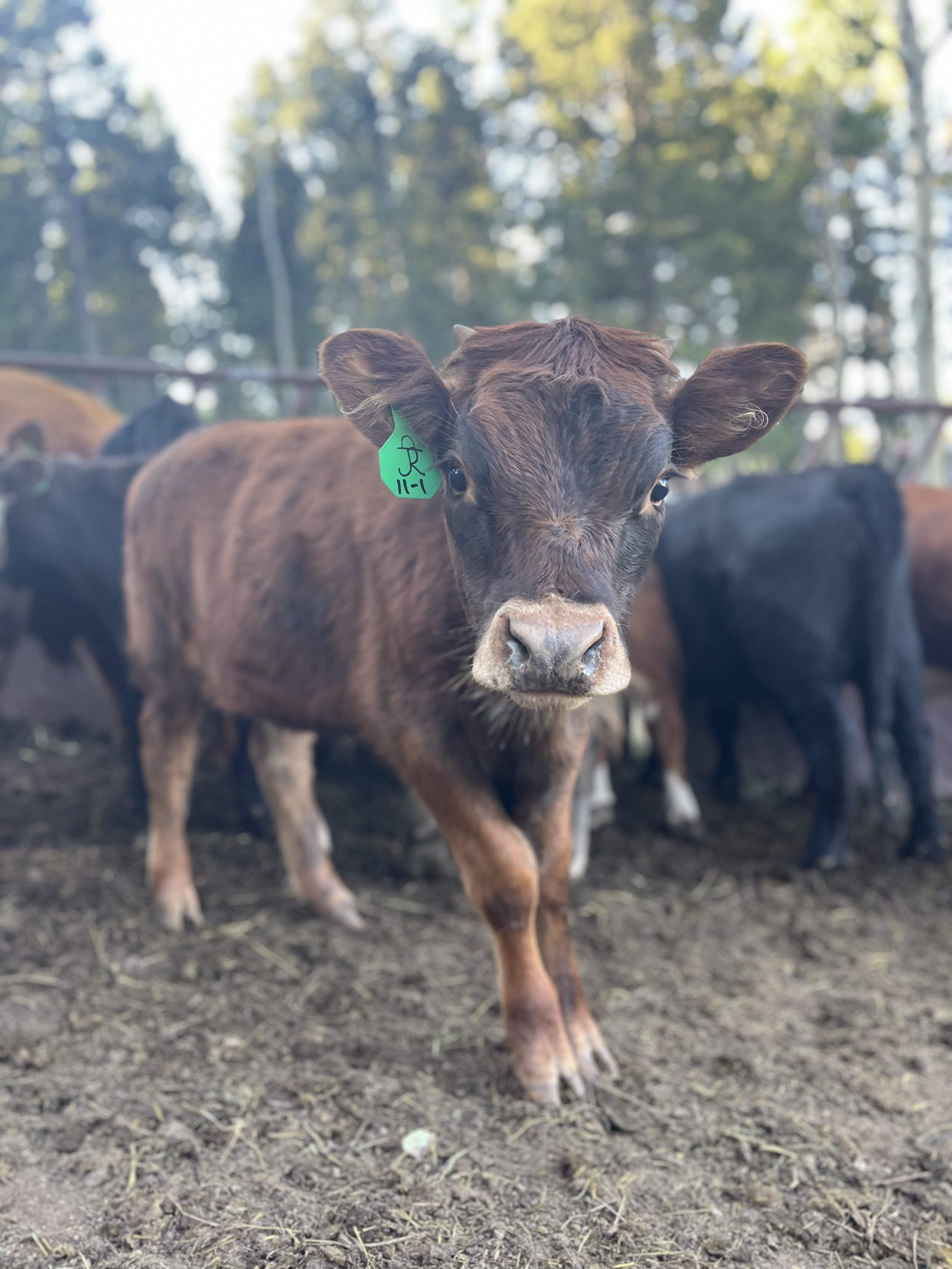 Flauta was born 3/30/25. Momma is Eleven, a black Aberdeen and Dad was a red Dexter/Highland cross. Flauta was born a light tan color but has turned into a red brindle color as she has grown.
