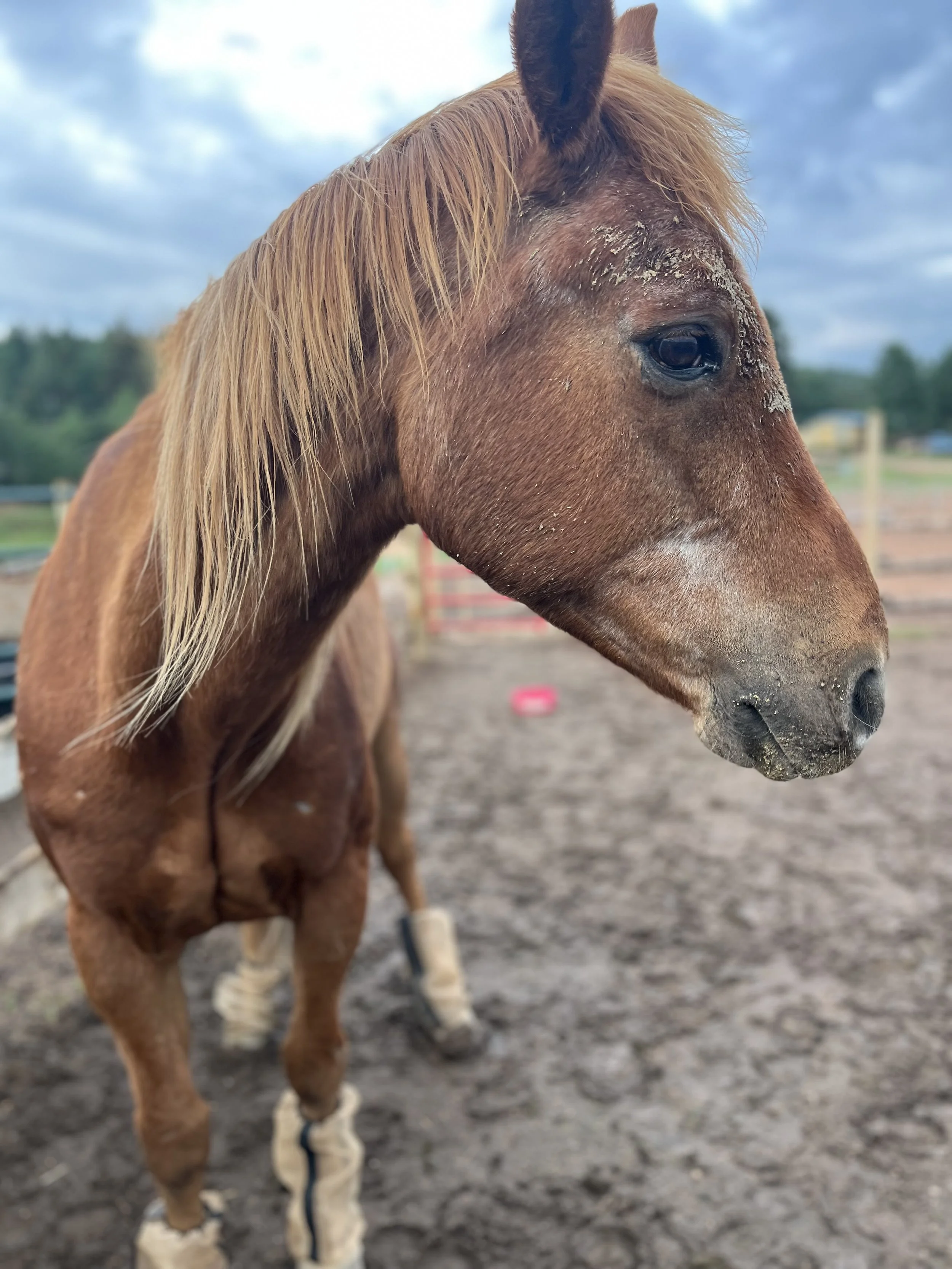 Poncho is in his mid-20’s and is a retired dude horse. This super sweet old man mostly just gets to roam around the ranch, but occasionally is used in our training sessions as a confidence builder for our riders. Poncho will be living out the rest of well earned retirement here at our ranch.