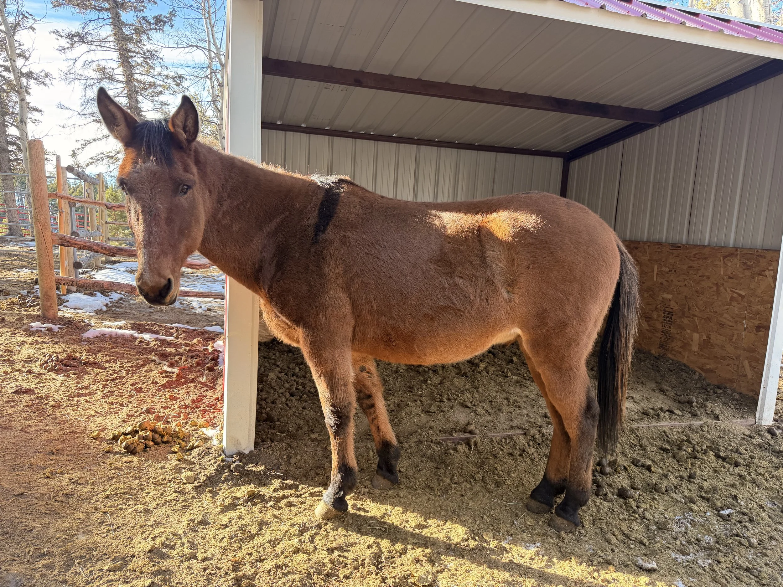 Jericho is a 14 year old john mule that came to us from an outfitter where he used to ride and pack. He is starting his training program to get a full tune up and will make a great adventure partner when he is done.